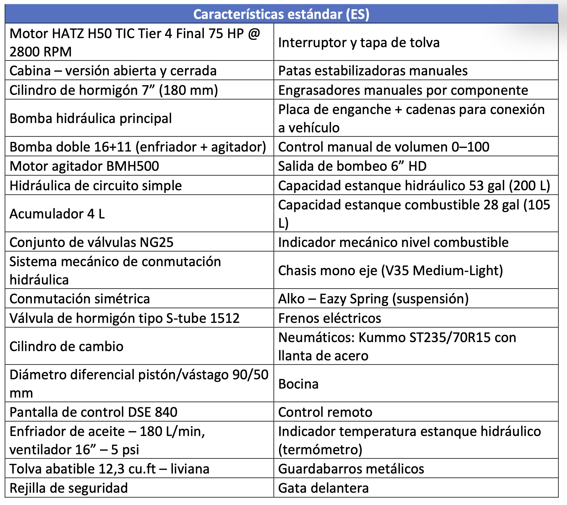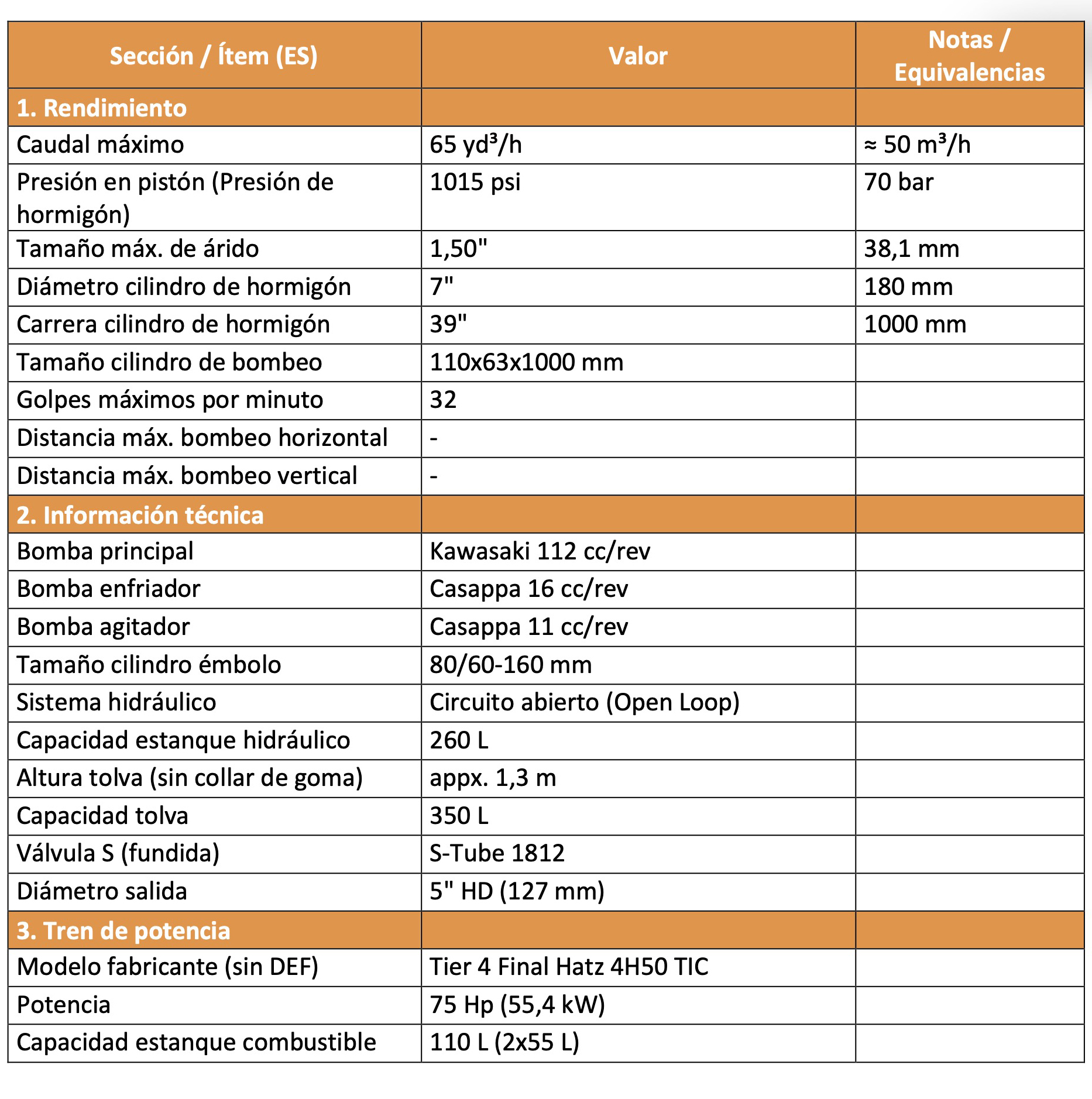 • Sistema de bombeo robusto: cilindro de hormigón 7”, carrera 1000 mm y hasta 32 golpes/min, diseñado para un bombeo continuo y estable.